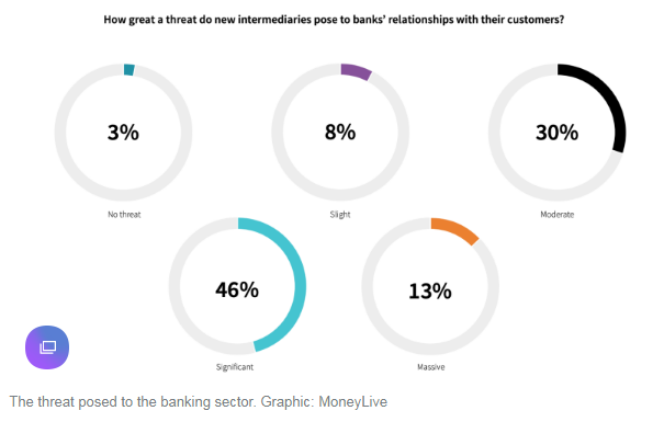 Almost six out of ten (59 per cent) of the bankers we surveyed perceive new intermediaries to be a significant threat to their relationship with their customers…From Amazon to Airbnb, Netflix to Uber, the story of digital disruption has not ended well for those incumbents unable to match the personalised experience and compelling cost savings of the newcomers.