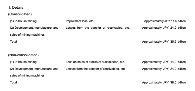After taking into consideration changes in the current business environment, [GMO] expects that it is difficult to recover the carrying amounts of the in-house-mining-related business assets, and therefore, it has been decided to record an extraordinary loss.