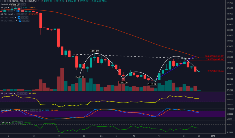 There appears to be a slight head and shoulders formation with a neckline at $4,160 solidifying on the daily chart. A move above $4,040 would place BTC above the 61.8% Fib retracement level, and further gains above $4,100 would be convincingly bullish as BTC would trade above head and shoulder neckline and also above the 78.6% Fib retracement level which aligns near the lower arm of the recent ascending trendline and the 50-MA.