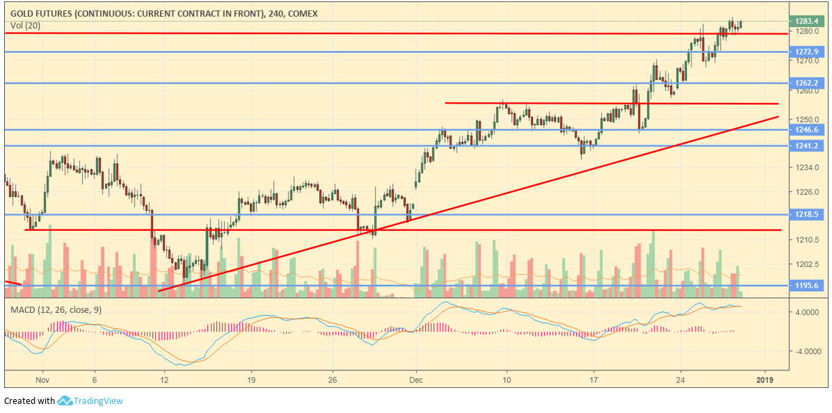 Things might get heated on the first days of the year, as volatility is expected to rise, and a spike above $1300 might be followed by a sharp pullback in the metal, due to the overbought momentum readings. Gold finished the week near a weaker resistance zone close to the $1280 price level, and above $1300, the yearly highs near $1350 lie ahead as strong resistance. Key support is found near $1245-$1250, and traders and investors could continue to buy the dips here.