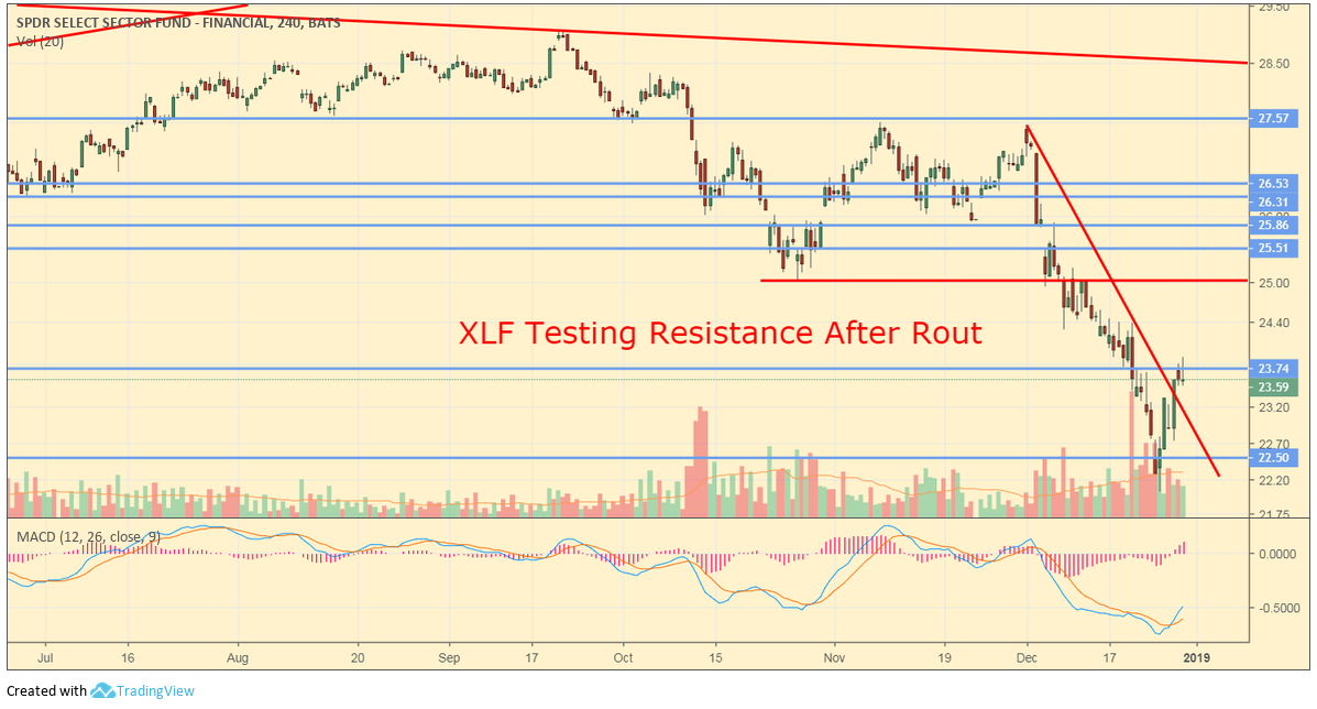 The coming weeks could be crucial in deciding whether we are already seeing the start of a cyclical bear market in the sector, but from a technical standpoint, that’s exactly how it looks like. The XLF ETF fell straight through several support zones before bottoming out near $22, its lowest level since late-2016, and despite this week’s short squeeze, the chart of the financial ETF looks deeply wounded.
