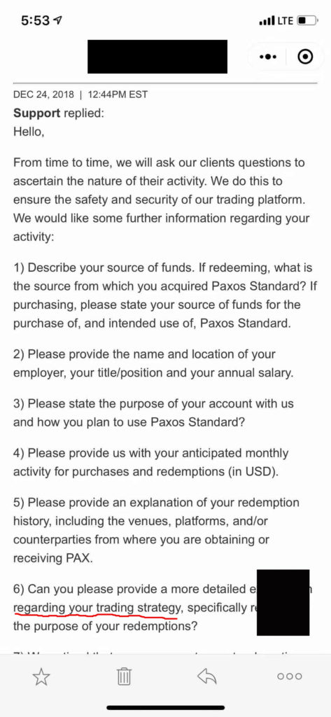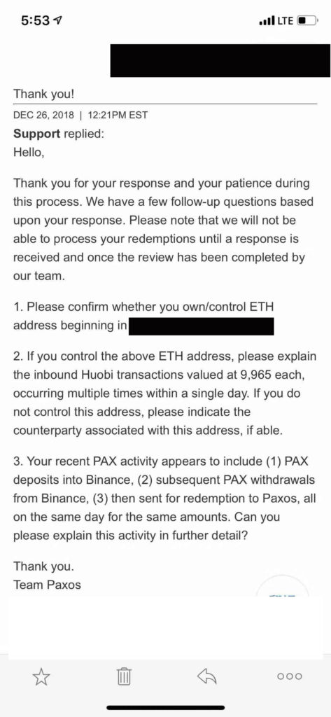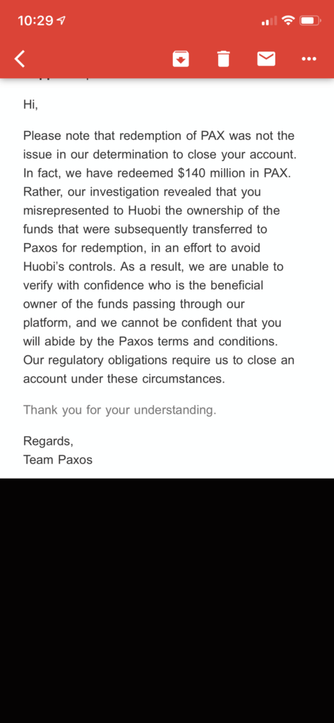 I think they just try to find some unrelated compliance reason to stop us from redeeming PAX. They asked a lot questions on out accounts on Huobi and Binance, even asked our counter parties’ information which is highly confidential. We never would disclose our counter parties’ information to anyone without their consent. They asked many questions and then closed our accounts. This is the way how they stop people from redeeming PAX and how they do business.