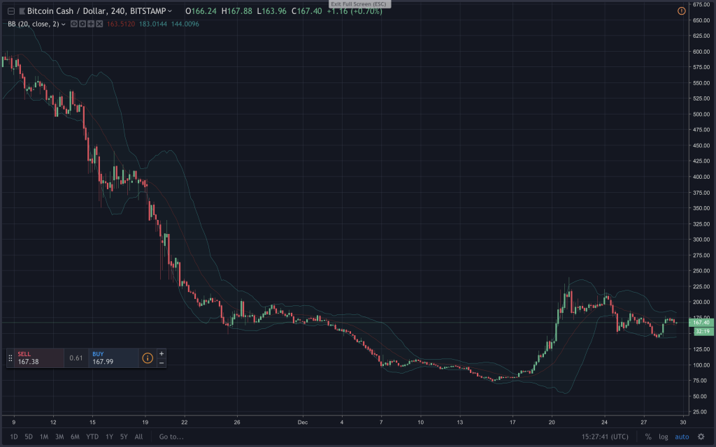 The top five exchanges trading the most BCH on Dec. 29 includes Lbank, Binance, Huobi, Coinbase, and Hitbtc. The largest currency pair trading against BCH is tether (USDT) which is capturing 44.5% of all trades. This is followed by BTC (20%), ETH (15.8%), USD (9.2%), and JPY (4.5%). The EUR has increased to 2.7% alongside the KRW’s 2.6% which typically is a good sign of markets becoming more bullish.