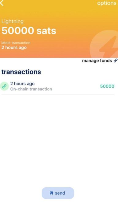 After about five confirmations, the LN wallet had satoshis in it and was ready to strike. However, since only one LN wallet can be set up in the app (for now), it was impossible for me to try sending sats back and forth within the app.