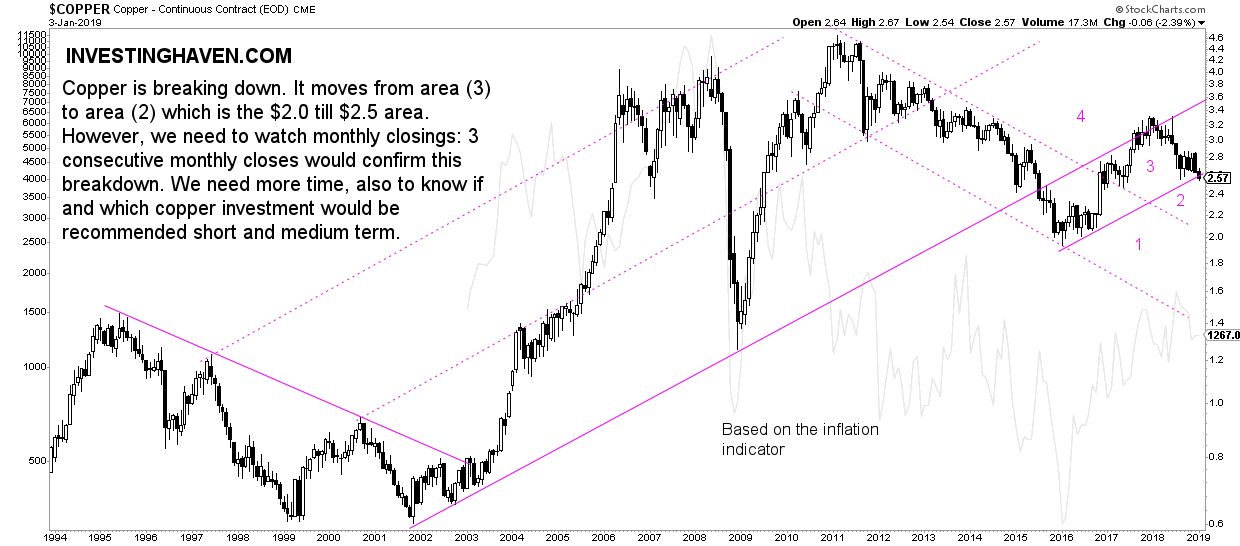 We concluded recently that the copper price is likely going to continue to move in its rising channel, which is indicated with (3) on below chart. We said that “this would be in line with mild inflation and a Euro that would not break down. In such a scenario our copper price forecast for 2019 is in the range of $2.6 to 3.2.”