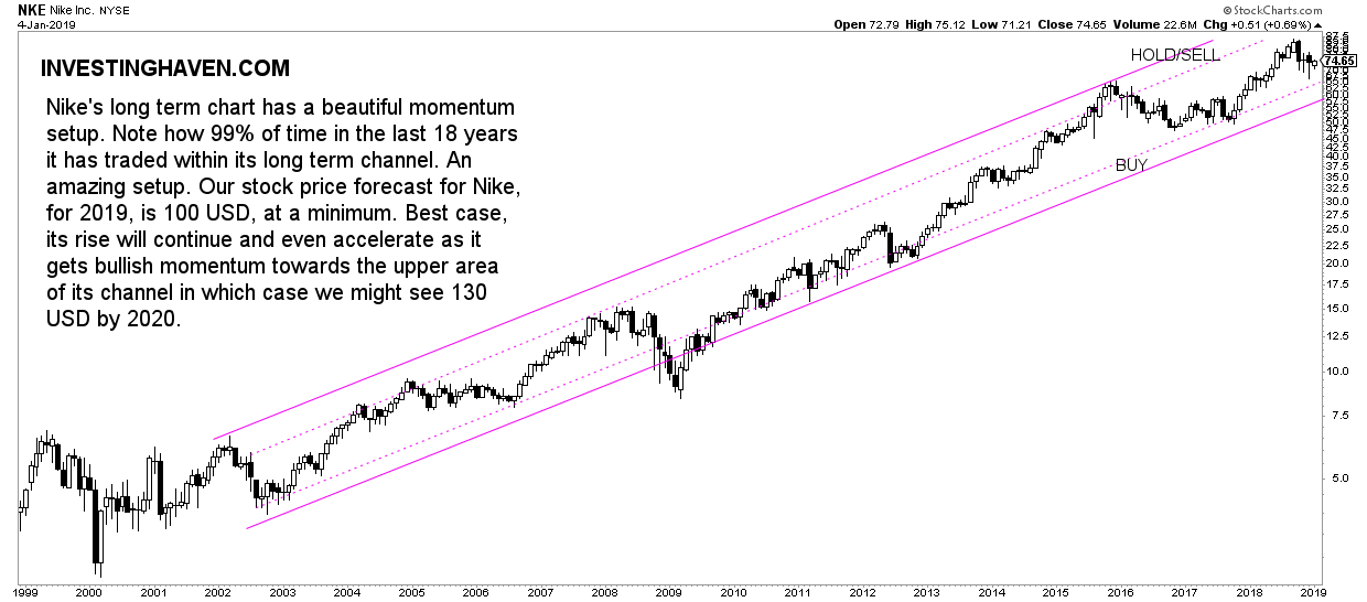 We see that a bullish Nike stock forecast for 2019 and beyond is not only confirmed by its chart pattern but also by its financials and fundamentals. This leaves us with a high level confidence forecast of $100 by 2019, and, most likely, unless a crash takes place in broad markets, $130 by 2020.