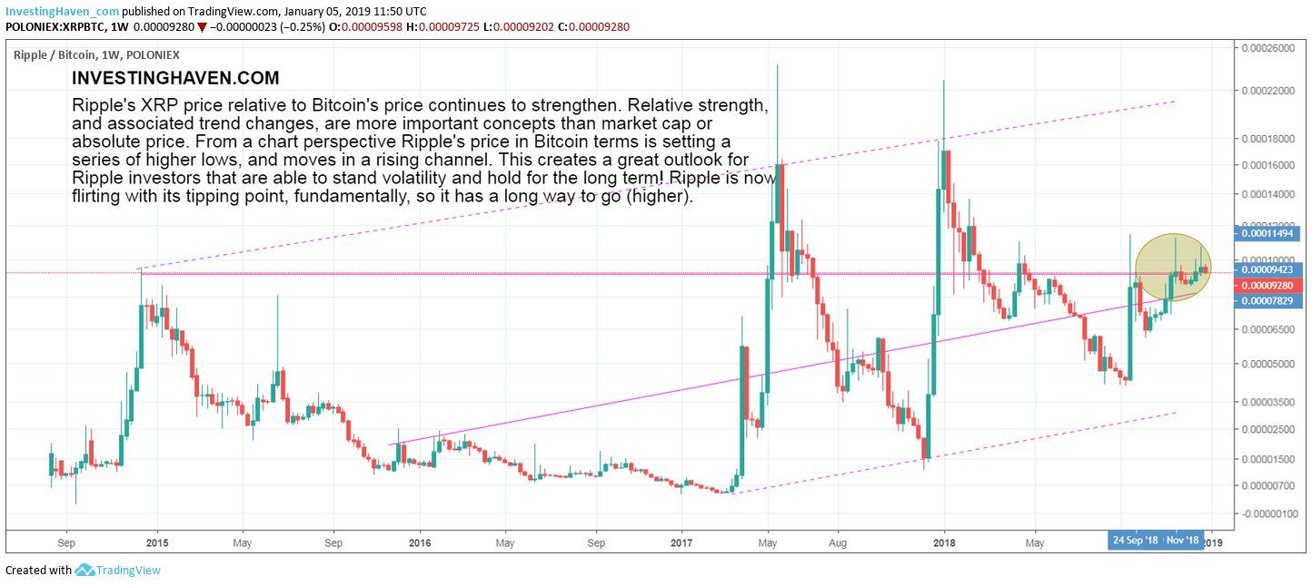 In the meantime, the long term relative strength chart of XRP in the crypto space looks awesome, truly. We use the XRP to BTC price chart to this end. XRP to BTC remains in a long term uptrend, and we start seeing signs of a breakout of XRP as it may take our previous highs of the last 8 months.