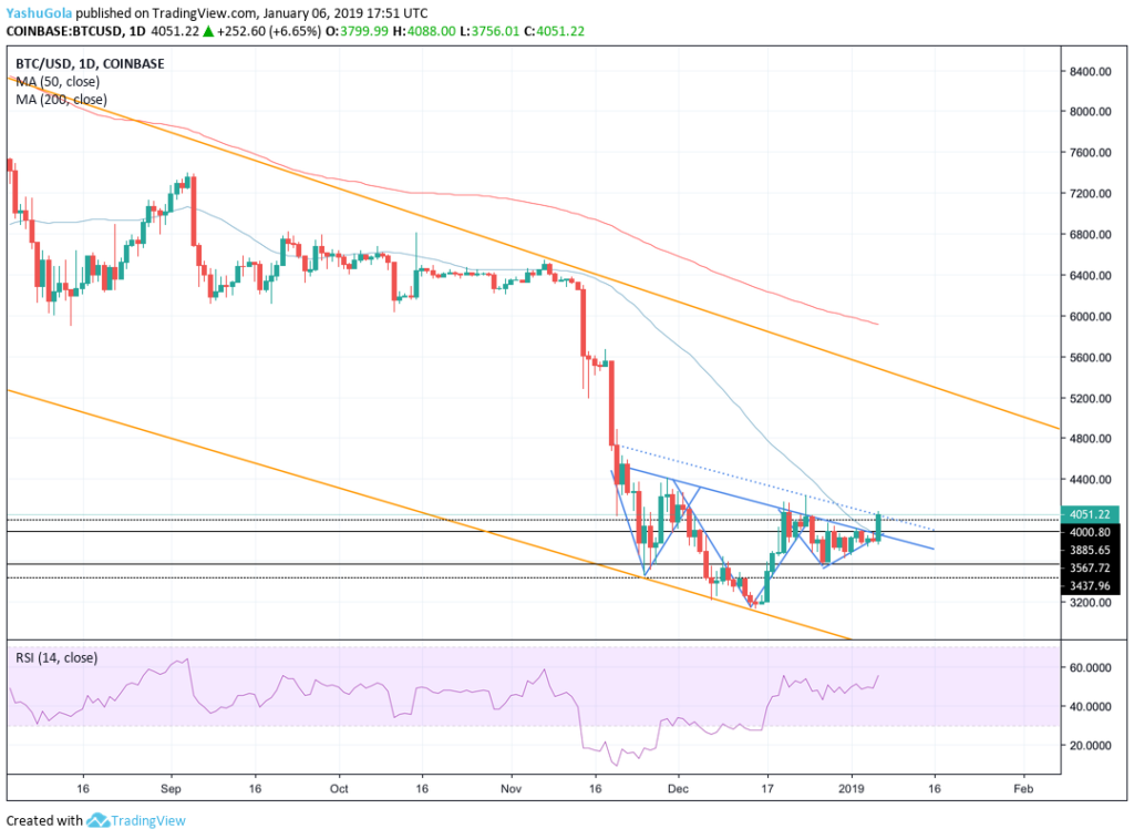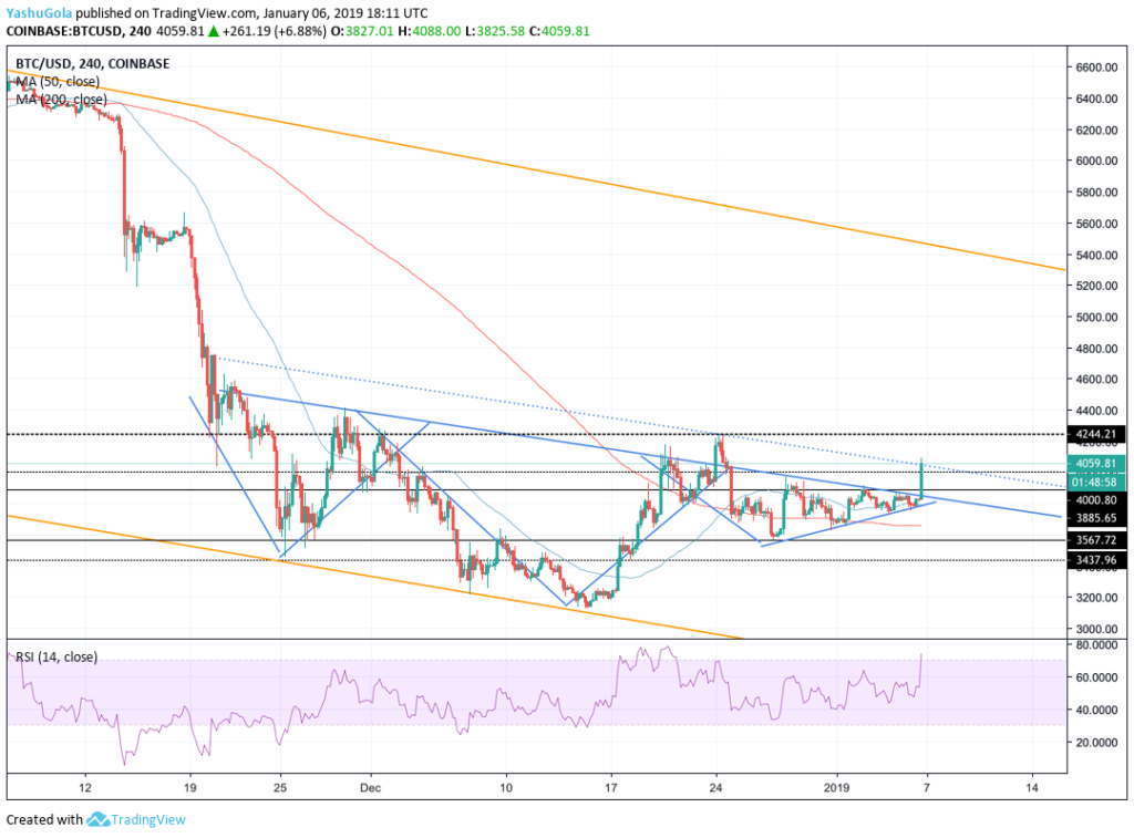 The bitcoin-to-dollar rate established its intraday peak at $4,085 but underwent a minor correction action to trade at $4,051 at press time. The pair had been attempting to break through $4,000 since December 28, but a stronger selling sentiment near the area rejected upsides on four occasions. Today was the first time bitcoin came closer to testing its two-week high at $4,244.