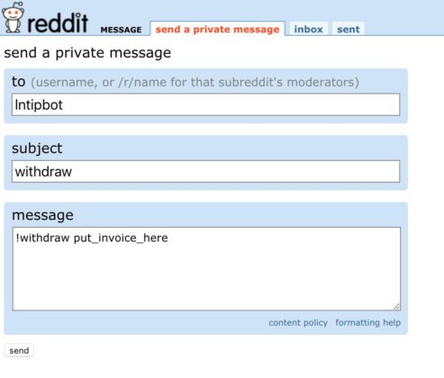Copy and paste that invoice address to replace the “put_invoice_here” in the message box and Send the message to the Reddit Ln tipbot.