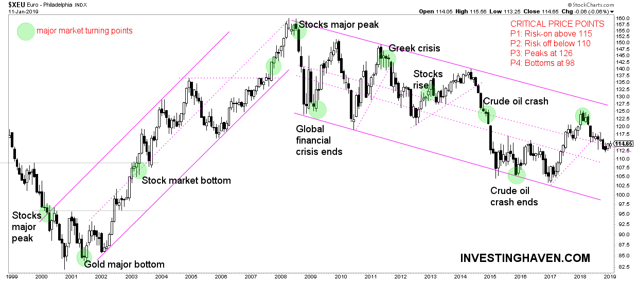 As said before the Euro has been leading the price of gold. Every time the Euro tested secular support or resistance, or broke out or down, it preceded an important top or bottom in the gold price.