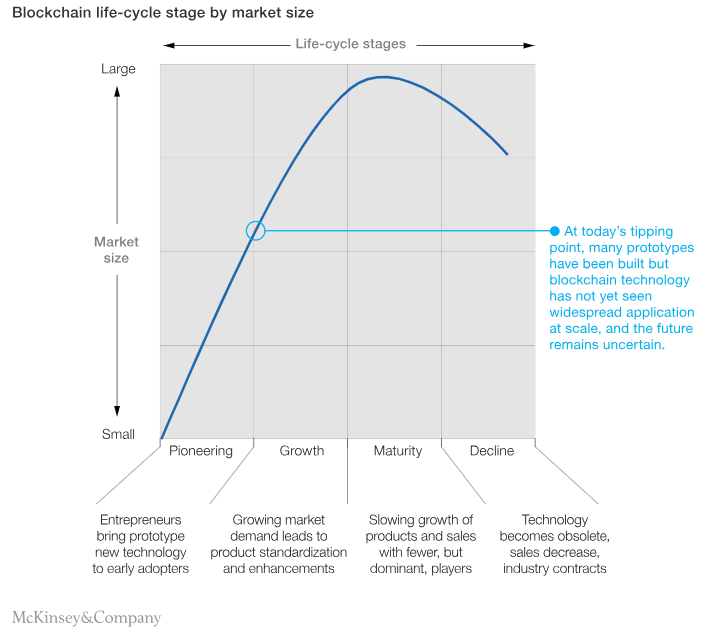 The consulting firm states that blockchain is an infant teleology that is “unstable, expensive, and complex. It is also unregulated and selectively distrusted.” A chart is included in the report, illustrating the industry struggling to emerge from the first stage of a four-stage cycle moving from pioneering to growth, maturity, and decline.