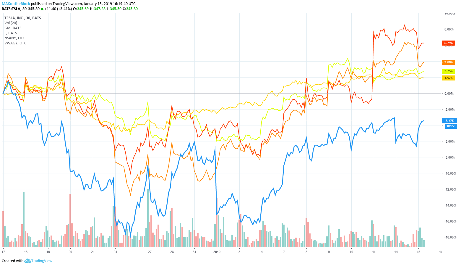 Tesla shares are up 4% so far today. General Motors stock is so far down 1.22% and Ford is down 1.72%.