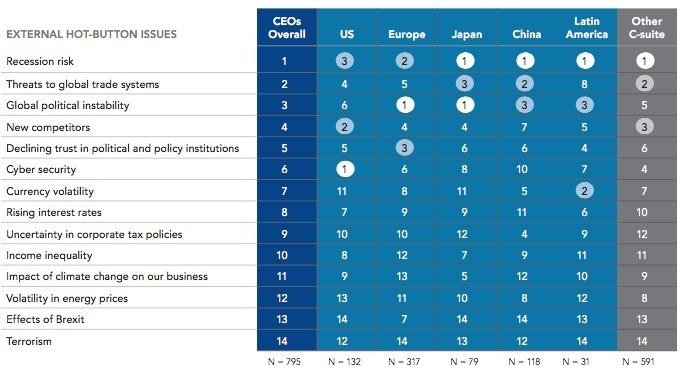 Global CEOs, especially in Asia and Latin America are worrying about the risk of recession. US business leaders, however, appear more concerned about cybersecurity and competition than a potential economic slowdown or the ongoing US-China trade war.