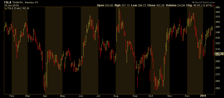 Tesla’s stock specifically has lost 13 pct on Friday January 19th, 2019. This might lead to a very bearish situation, and might imply a sell in 2019 for Tesla’s stock.