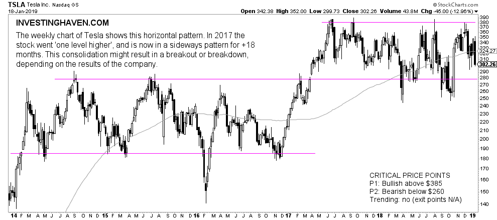 The weekly chart of Tesla shows this distinct horizontal pattern. In 2017 the stock went ‘one level higher’, and is now in a sideways pattern for +18 months.