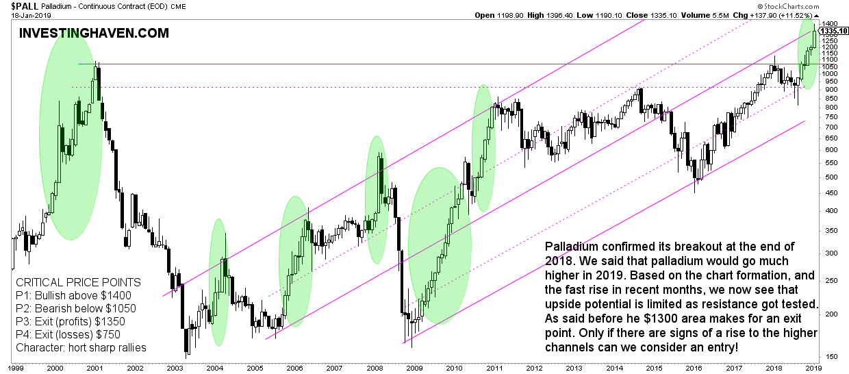 InvestingHaven’s research team is on record with a palladium price forecast for 2019 of $1375 which likely will be a medium to long term top. It certainly is a profit taking price level if and once it gets there. Our thesis is invalidated if the $1125 does not get broken to the upside, or if a breakout appears to fail.