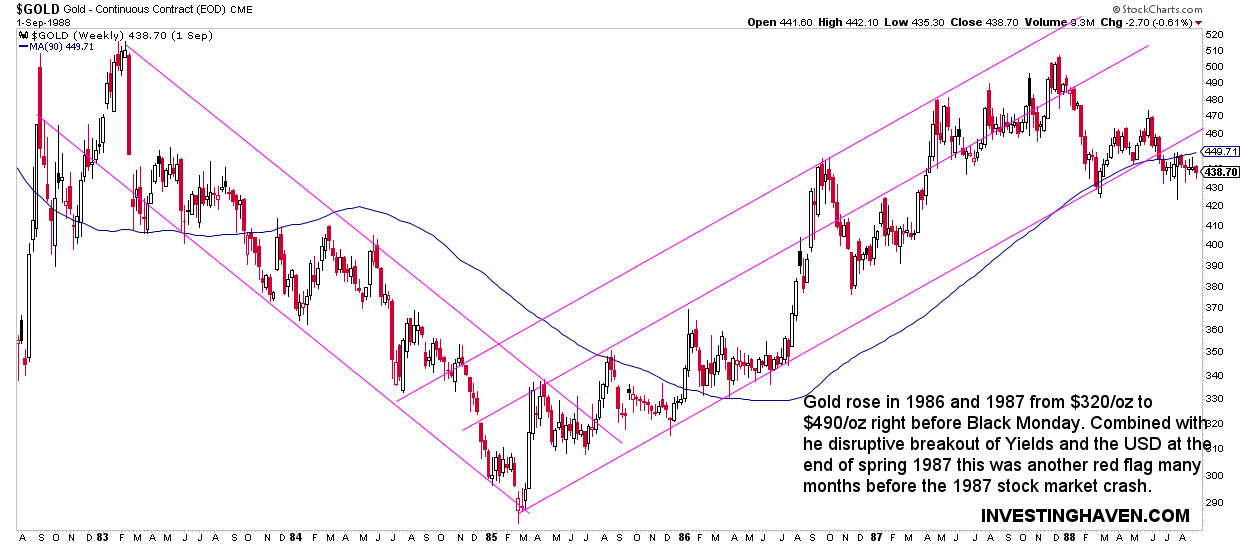 Gold rose in 1986 and 1987 from $320/oz to $490/oz right before Black Monday. Combined with he disruptive breakout of Yields and the USD at the end of spring 1987 this was another red flag many months before the 1987 stock market crash.