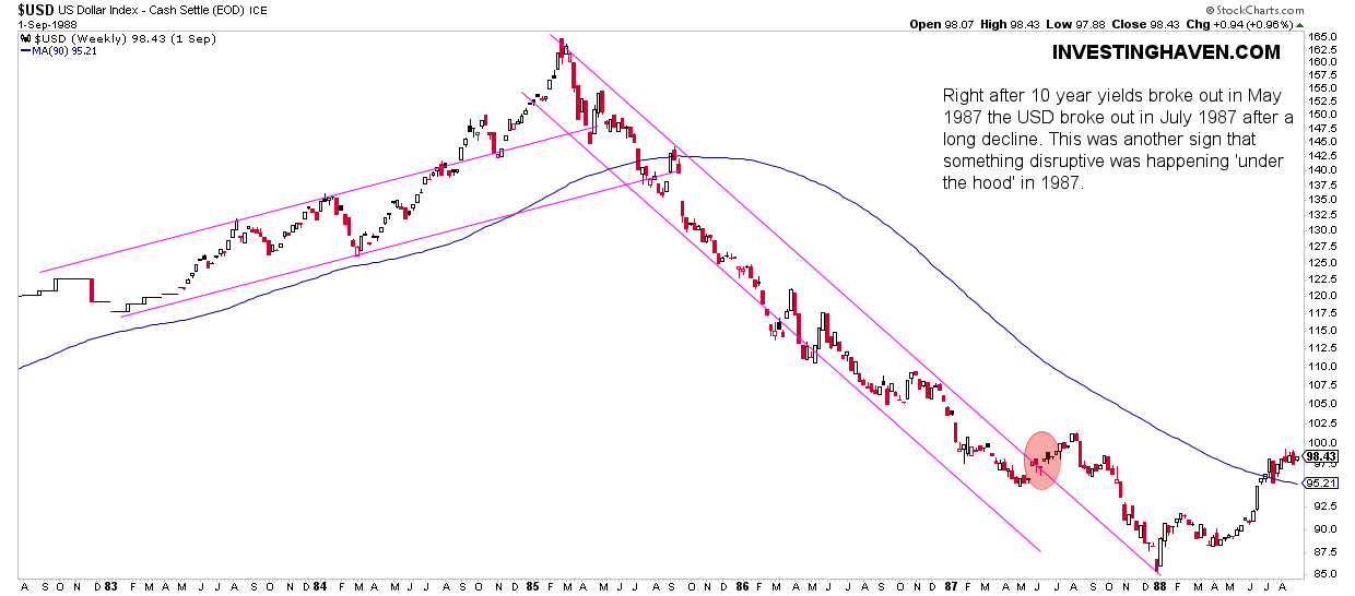 Right after 10 year yields broke out in May 1987 the USD broke out in July 1987 after a long decline. This was another sign that something disruptive was happening ‘under the hood’ in 1987.