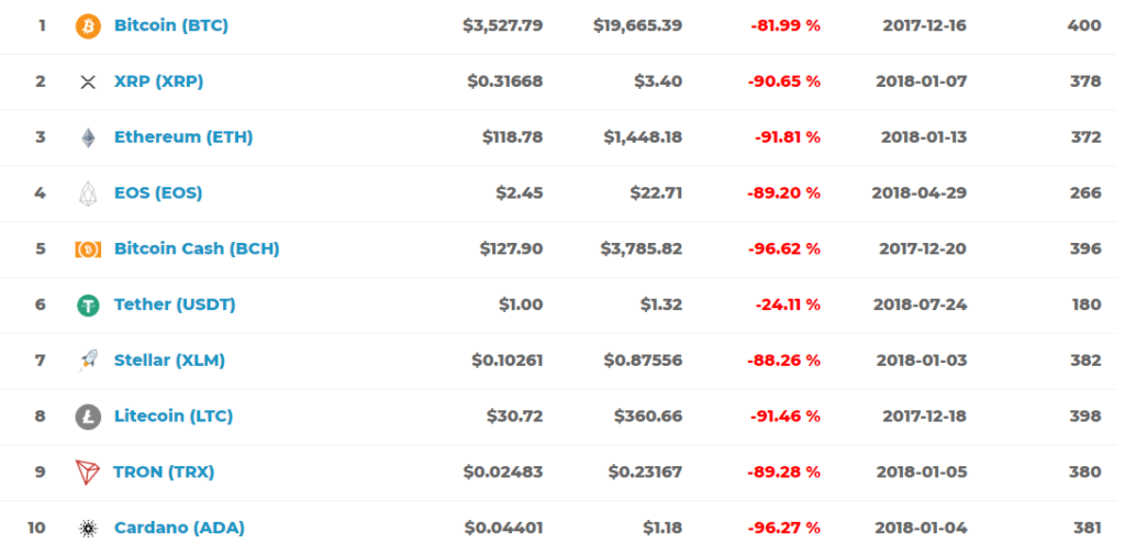According to the data provided by ATHCoinIndex, most major crypto assets such as Ripple, Ethereum, Bitcoin Cash, Litecoin, and Cardano have fallen by 90 to 97 percent from their all-time highs against the U.S. dollar in the past 12 months.