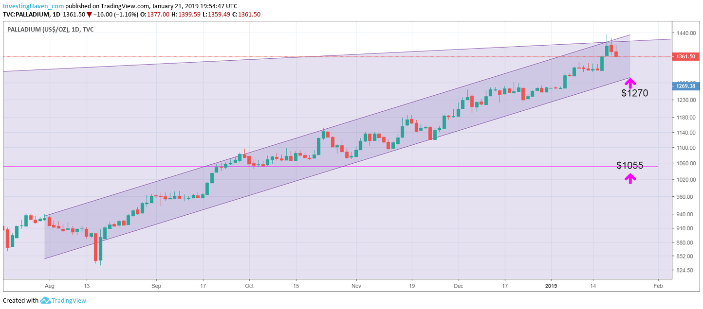 Our palladium price forecast 2019 of $1375 got hit already a week ago. As palladium is in the news with some good excitement many investors might be seduced to look for an entry point. However, buying palladium at all-time highs might not be the most wise thing to do. This article depicts 2 potential entry points to get exposure to palladium in a high reward low risk manner. In doing so we try to educate readers on the approach to manage risk.