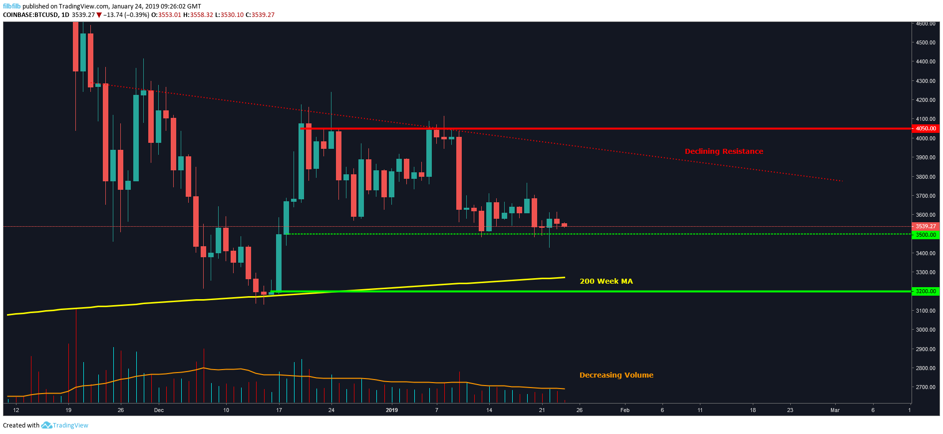 The daily chart largely remains unchanged, with Bitcoin consolidating above preliminary support of $3500 on low volume and remains in the weekly range between around $4000 and $3200.