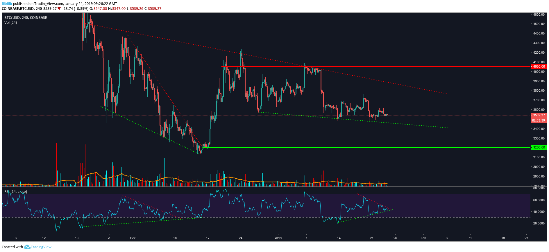 Looking to the 4-hour chart for clues, it is slightly easier to see the market structure. The downward channel that bitcoin is locked in has some minor resemblance of a falling wedge with some bullish divergence on the RSI. This would fit the narrative of there being buying interest below.