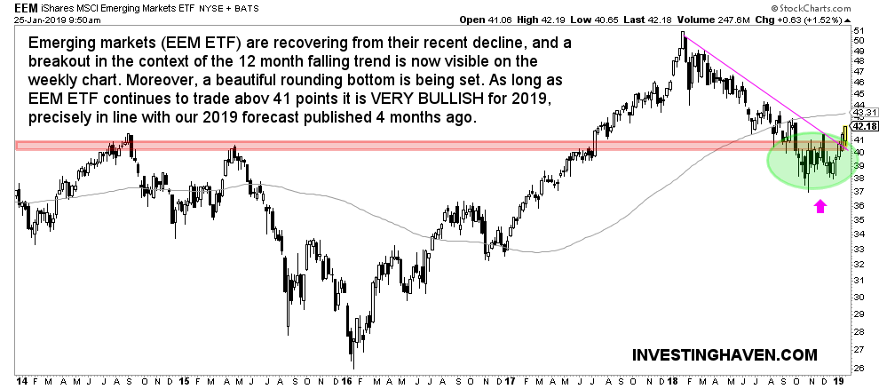 As long as EEM ETF continues to trade abov 41 points it is VERY BULLISH for 2019, precisely in line with our 2019 forecast published 4 months ago.