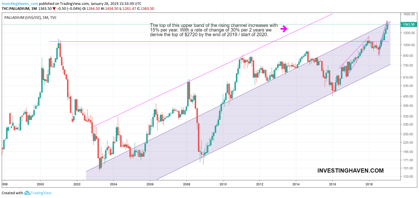 If palladium succeeds to break through $1440, and trade at a minimum 5 consecutive days above $1440 and closes 2 consecutive months above $1440, it will likely rise to $2720 in 2019 where investors must take profits!