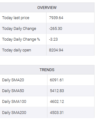Bitcoin (BTC/USD) is on the rise above its main simple moving averages (SMAs). The main resistances to the upside are seen at 8,750.00; 9,375.00 and the 10,000.00 level. On the way down support is seen at 7,500.00; 6,875.00; 6,250.00 and the 5,000.00 level.