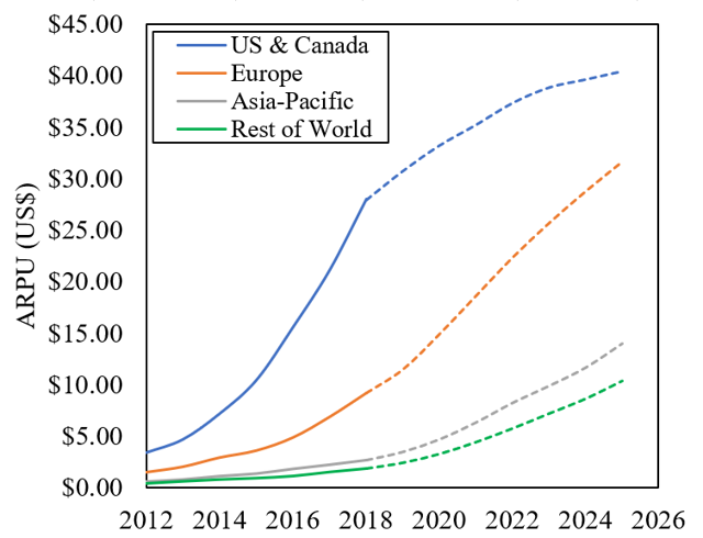 - Over the next 10 years, the ARPU in Asia-Pacific (US$2.68/user in 2018) and the Rest of World (US$1.88/user in 2018) catches up to Europe’s ARPU today (US$9.17/user, 2018), while Europe’s ARPU gradually catches up to North America’s ARPU today (US$27.99/user in 2018)