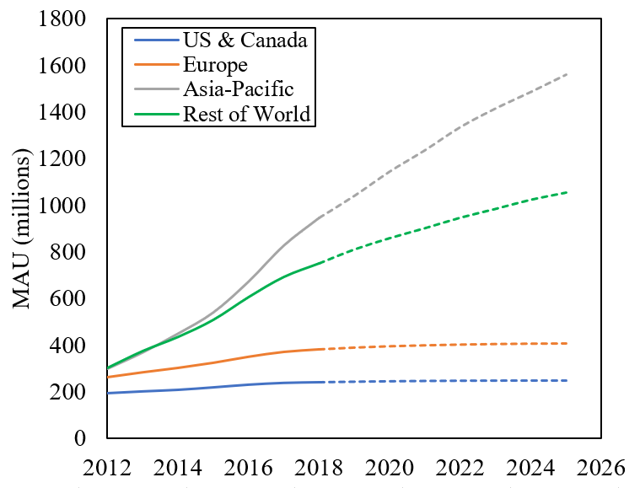 Figures 1 & 2: Facebook’s historical and projected MAU and APRU. These figures were developed by the author, with its historical data obtained from Facebook’s Annual Reports (2012 to 2018).