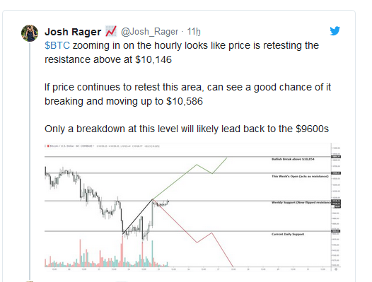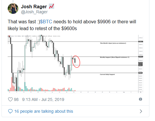 “That was fast. $BTC needs to hold above $9906 or there will likely lead to retest of the $9600s,” Rager said while referencing the below chart.