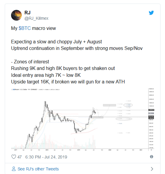 “My $BTC macro view: Expecting a slow and choppy July + August. Uptrend continuation in September with strong moves Sep/Nov. Zones of interest: Rushing 9K and high 8K buyers to get shaken out. Ideal entry area high 7K ~ low 8K. Upside target 16K, if broken we will gun for a new ATH,” he explained.