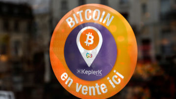© Reuters. A sticker of French startup Keplerk, indicating that clients can purchase bitcoins, is…More