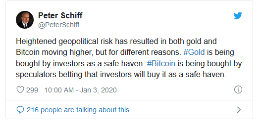The price of Bitcoin rallied by more than five percent on the news about the US killing the Iranian top general Qassem Soleimani. This prompted many crypto enthusiasts to further push the ‘safe haven’ narrative but gold bug Peter Schiff has a completely different take — these price moves were prompted by speculators.