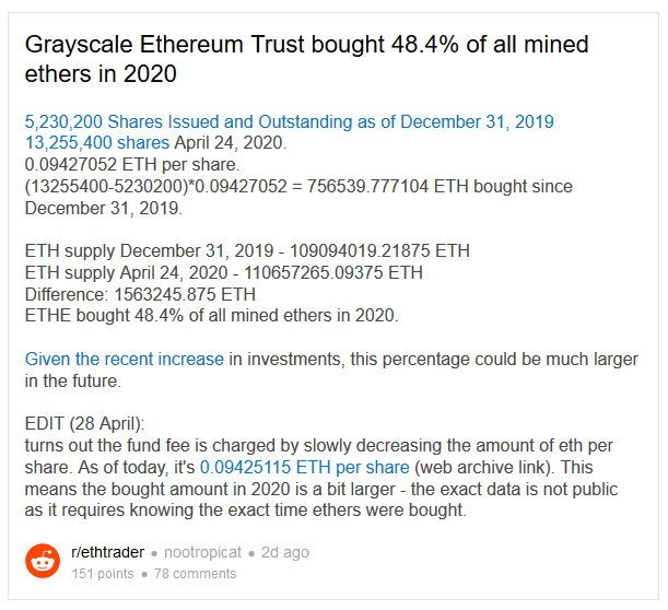 Grayscale bought 756539.777104 ETH since December 31, 2019, which represents a little less than 50% of the total ETH mined during the year, this data can be verified by comparing the number of tokens that the firm had since December, concerning the last stats reported on its page.