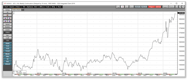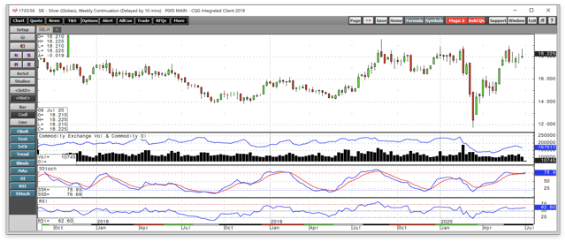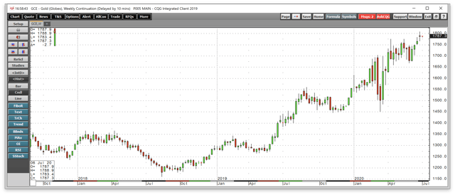 The weekly chart illustrates that gold had been in a bullish trend since the mid-August 2018 low at $1161.40 per ounce. Gold hit a peak at just under the $1808 level on the continuous contract in late June. The price corrected to a low at $1450.90 during Q1 but turned higher and rose to the highest price since 2011 at the end of Q2.