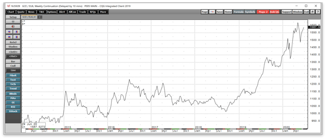 The weekly chart of gold in euro currency terms shows price appreciation since late 2018.
