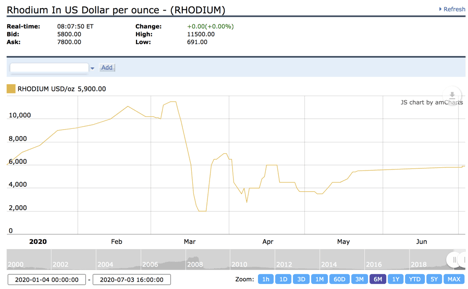 Rhodium rose to a new record high in 2020, but gravity hit the rhodium market during the risk-off period in March. Throughout most of Q2, the price of rhodium was steady and edged higher despite the loss on the quarter-by-quarter basis.